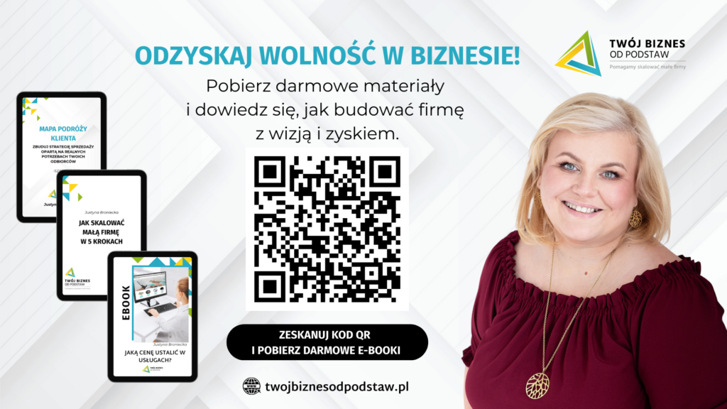 Jeśli chcesz uporządkować swój biznes i zobaczyć, jak skalować go bez dokładania sobie chaosu, przygotowałam bezpłatny materiał „Jak skalować firmę w 5 krokach”. To praktyczne spojrzenie na rozwój biznesu bez presji „jedynie słusznych” strategii — do pobrania wtedy, gdy będziesz gotowa.