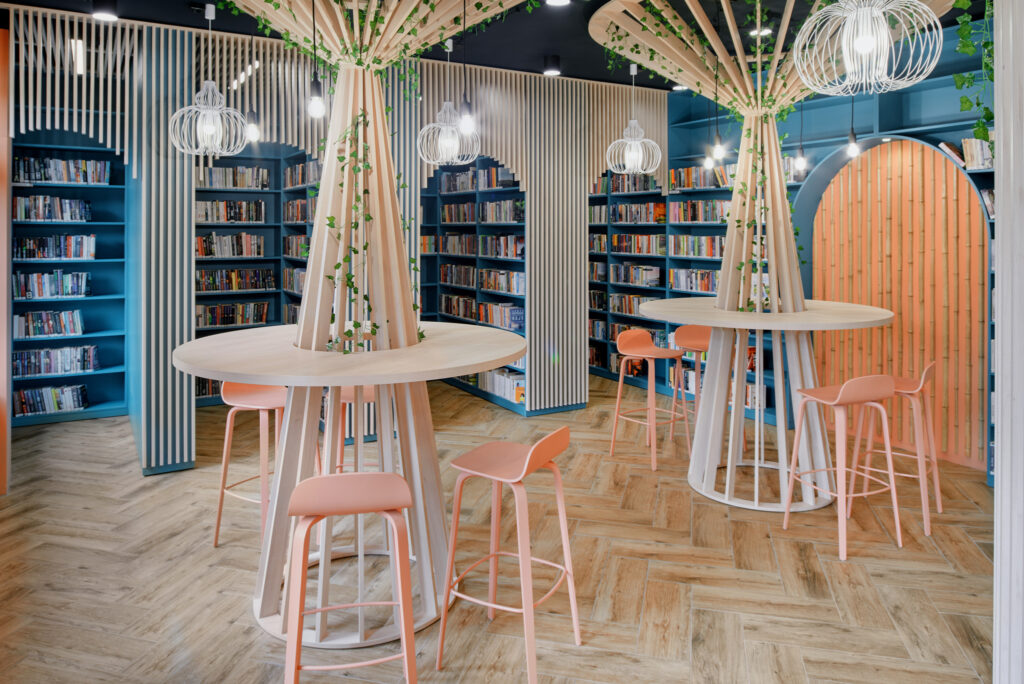 Zakres: projekt aranżacji wnętrz wraz z nadzorem autorskim, opracowanie nazwy projektowanej biblioteki