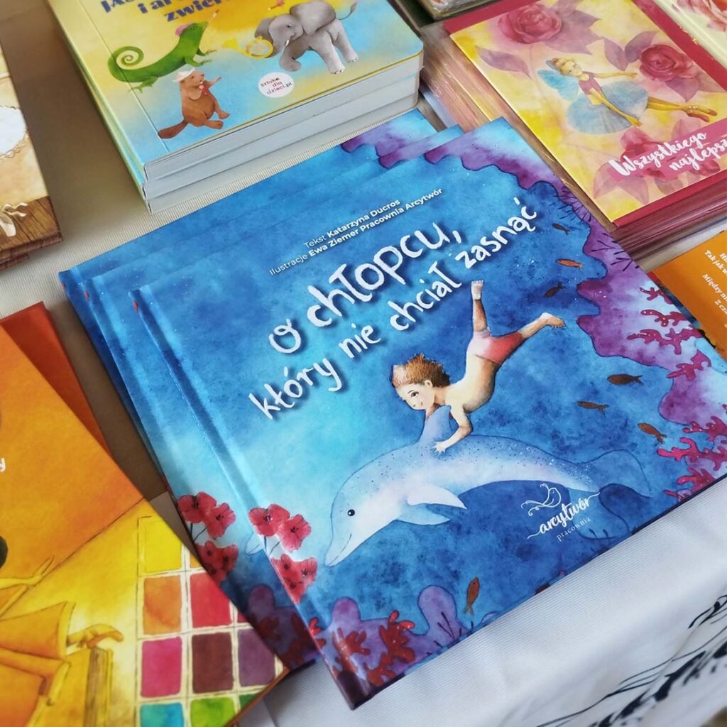 Zdecydowanie najbardziej dumna jestem z pierwszej książki wydanej w Pracowni Arcytwór – „O chłopcu, który nie chciał zasnąć” Katarzyny Ducros. Jest to w całości ilustrowana ręcznie akwarelami książka dla dziewczynek i chłopców – dla każdego dziecka, które kocha marzyć i używać swojej wyobraźni, na przykład w ulubionej zabawie dzieciństwa, czyli w tzw. zabawie „w udawanie” lub „na niby”. Któż nie lubi wyobrażać sobie, że łóżko to statek, a patyczek to magiczna różdżka?