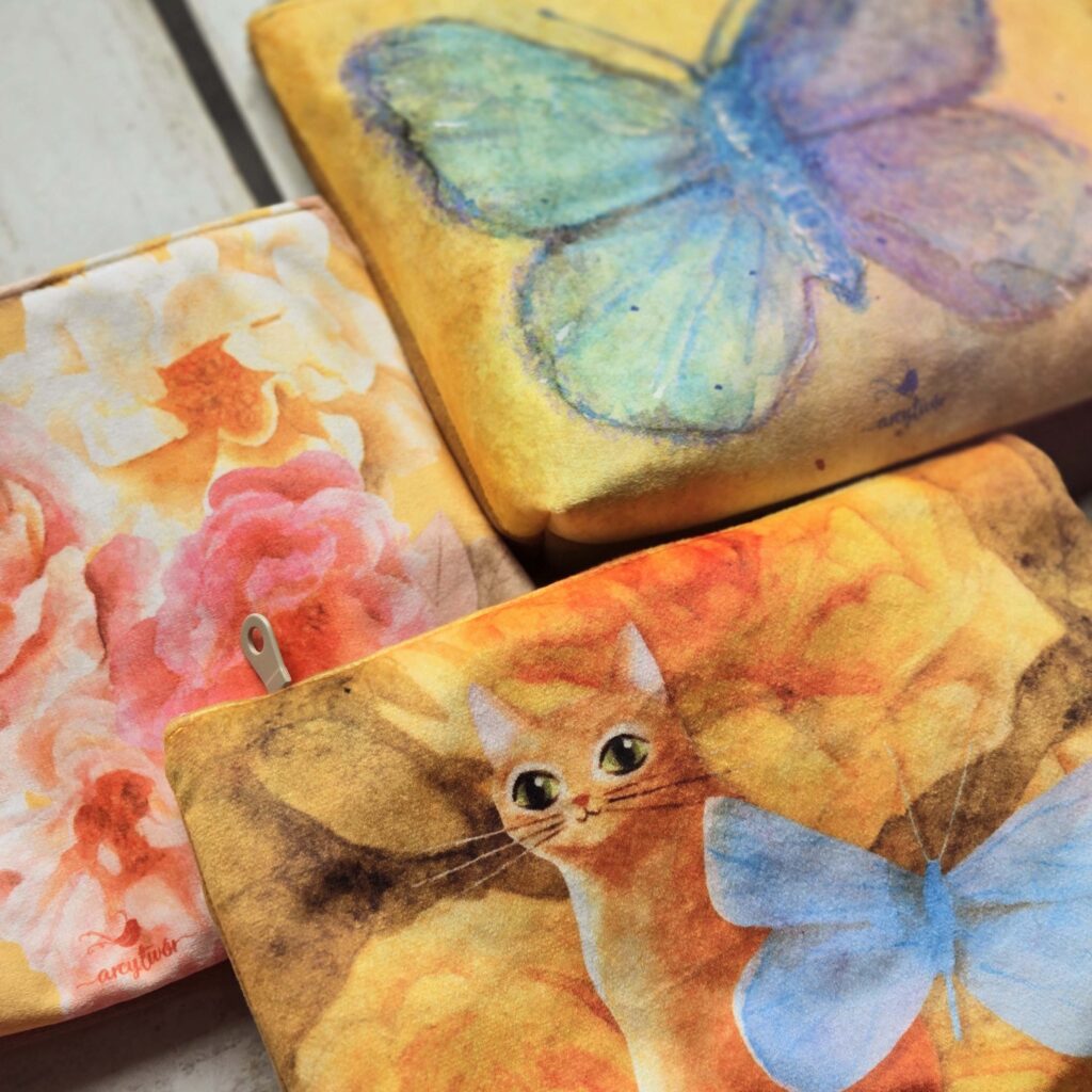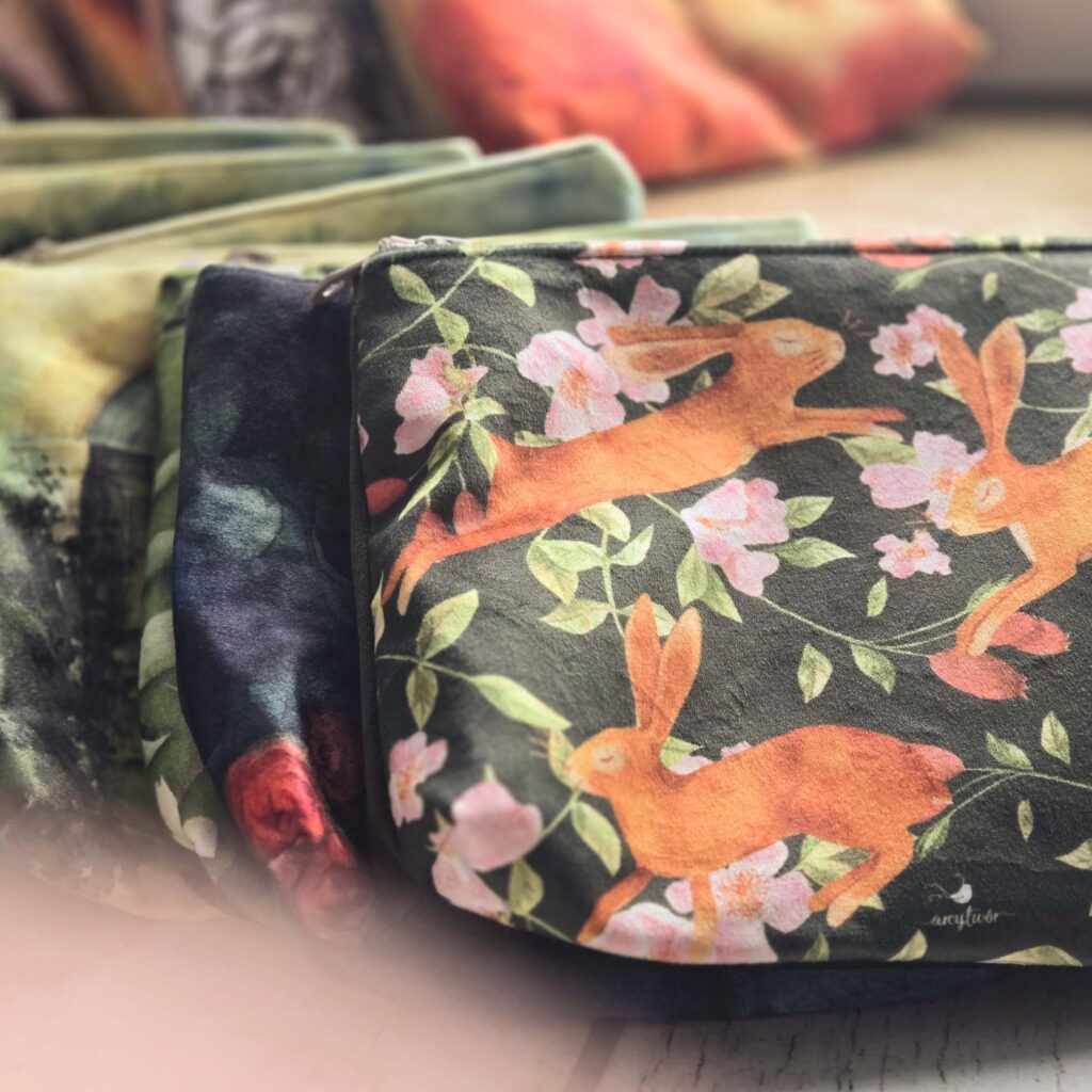 To wszystko trwa – zajmuje głowę, serce i czas. Trudno się więc dziwić, że tak bardzo zależy mi na tym, by akwarela była jak najwierniej odwzorowana na tkaninie czy ceramice w drukarni. Jestem w stałym kontakcie z drukarniami, po to, by mieć pewność, że ilustracja będzie wyglądać w druku jak najlepiej. Potrzeba mi było jednak nauczyć się otwartości, by zaakceptować drobne różnice w kolorystyce, które zależą od podłoża – rodzaju tkaniny czy powierzchni kubka – a na które nie mam wpływu. Spójność jest szczególnie istotna, gdy ktoś pragnie stworzyć zestaw produktów z konkretną ilustracją, która go urzekła: kubek i torba, kosmetyczka i piórnik, lub druk obrazu na ścianę i obrus do kuchni. Realizowałam już najróżniejsze marzenia moich klientów.