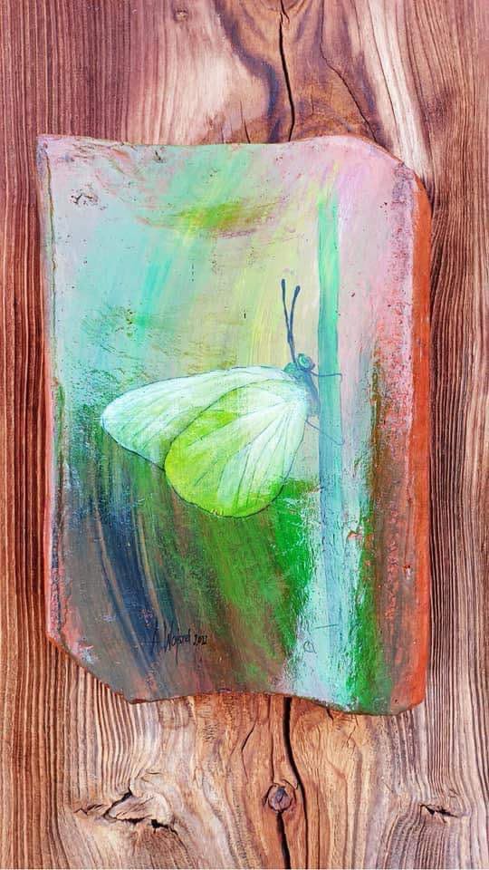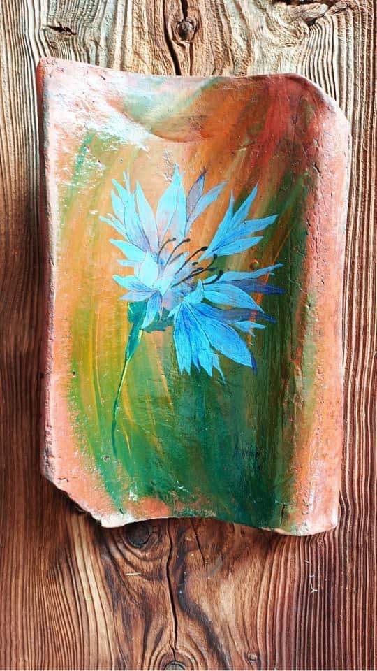 Niecodziennym elementem jej sztuki jest malowanie na starych dachówkach. Nadaje im nowe życie, tworząc obrazy, które łączą tradycję z nowoczesną wrażliwością artystyczną. Motywy roślinne, takie jak polne kwiaty czy pędy ziół, łączą się z historią zapisanej w materiale. Stara dachówka wykonana z