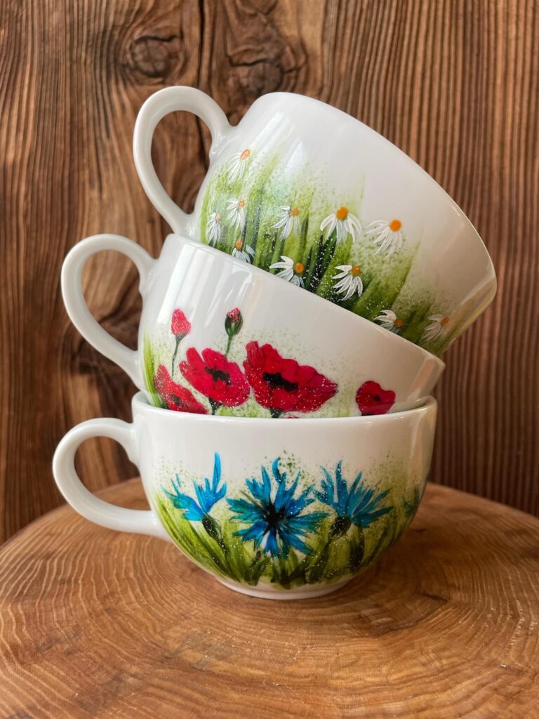 Jednym z najbardziej rozpoznawalnych aspektów jej twórczości jest malowanie porcelany. Artystka wykorzystuje delikatne linie i subtelne barwy, by odzwierciedlić piękno przyrody na filiżankach, kubkach czy talerzach. Motywy kwiatowe i ziołowe są jej znakiem rozpoznawczym. Każdy przedmiot staje się unikalnym dziełem sztuki, które nie tylko zdobi przestrzeń, ale również niesie ze sobą odrobinę natury do codziennego życia. To doskonały prezent dla wyjątkowej osoby lub pamiątka z regionu. Wyobraź siebie jak pijesz swoją ulubioną kawę lub herbatę ze specjalnie dla Ciebie pomalowanej filiżanki.