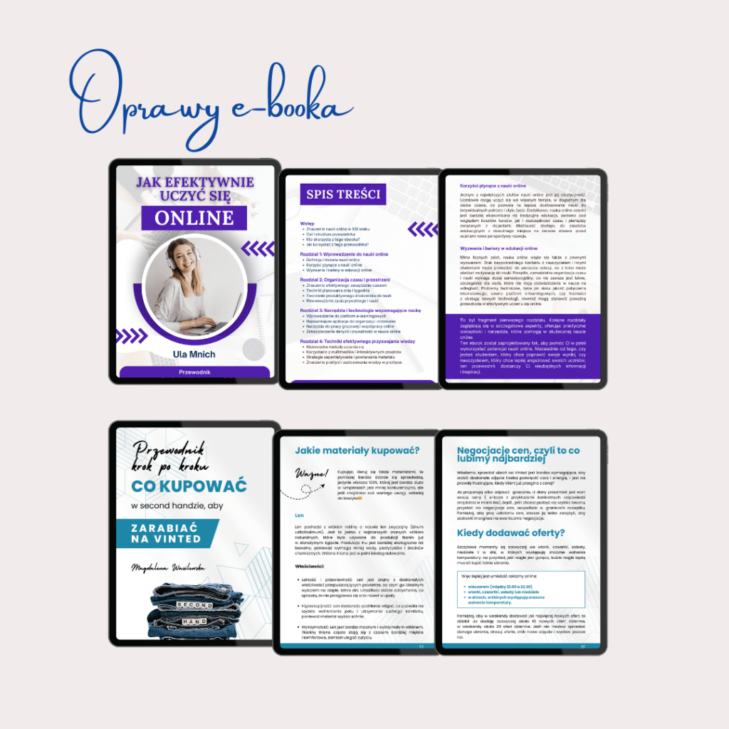 2. Zaprojektuję oprawę graficzną Twojego e-booka Każdy projekt dostosowuję do kolorystyki i fontów Twojej marki, aby całość była spójna z jej identyfikacją wizualną, a także zadbam o detale techniczne. Moje projekty wyróżnią Twój e-book na tle konkurencji i sprawią, że stanie się on unikalny, zarówno pod względem wizualnym, jak i użytkowym.