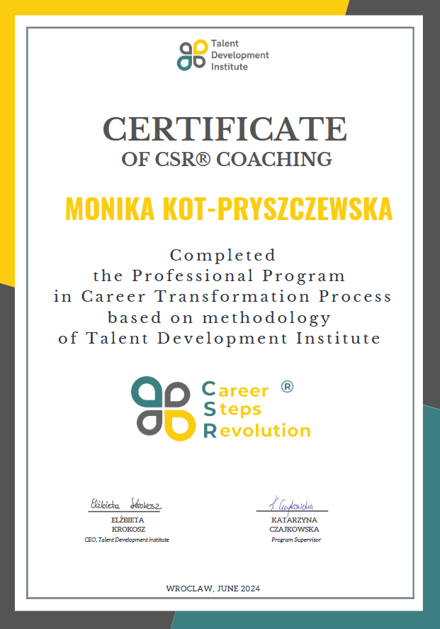 Nazywam się Monika Kot-Pryszczewska. Jestem Master Coachem, terapeutką pracującą z podświadomością, trenerką i przedsiębiorczynią z ponad 17-letnim doświadczeniem w rozwijaniu ludzi i biznesów. Specjalizuję się w transformacjach zawodowych, pomagając kobietom wypalonym zawodowo lub niezadowolonym z obecnej pracy odnaleźć swoje pasje, wartości i talenty. Wspieram w budowaniu pewności siebie, pokonywaniu wewnętrznych blokad oraz tworzeniu jasnych planów działania.