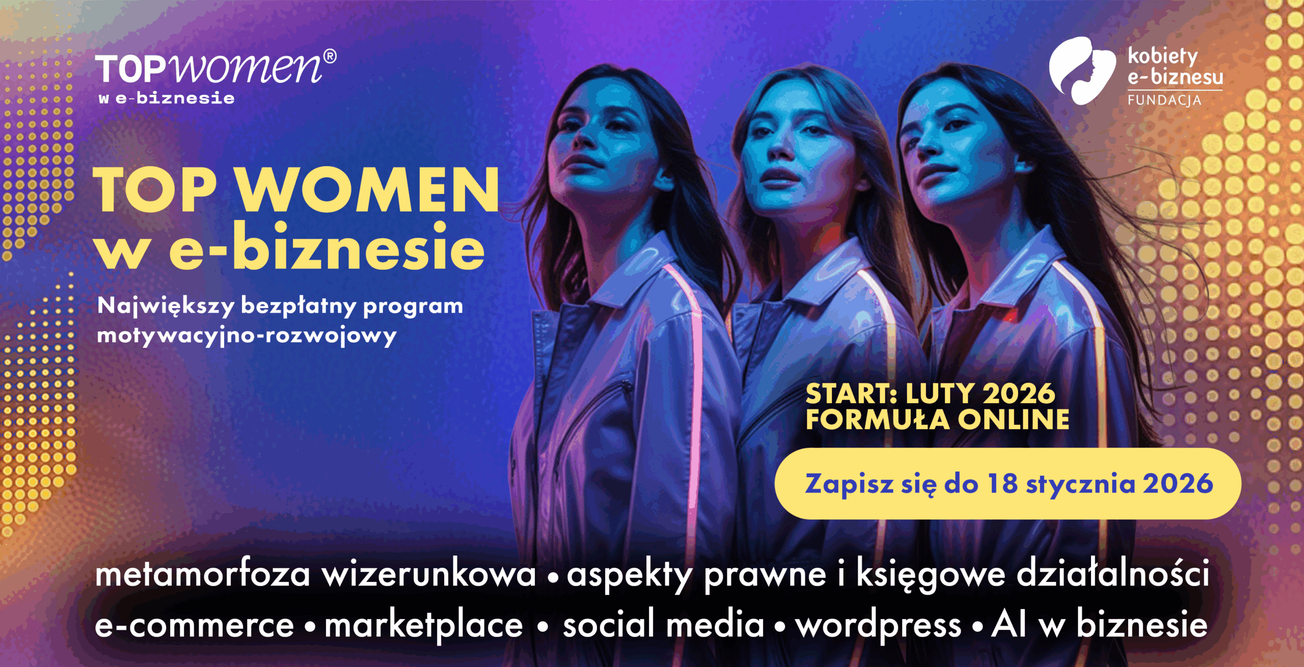 Ruszają zapisy do szóstej edycji programu TOP Women w e-biznesie 2026, organizowanego przez Fundację Kobiety e-biznesu. To jeden z największych w Polsce projektów edukacyjnych dla kobiet, który łączy naukę kompetencji cyfrowych, rozwój mentalny i realne wsparcie biznesowe.